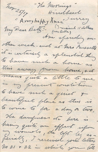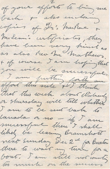 I am putting forth an effort this side & I think that this week about Wednesday or Thursday will tell whether I am to be sent back to Canada or no - if I am successful then I shall likely be leaving Bramshott next Sunday Dec 2nd for Bruxton there to wait my turn for a boat. I am still not counting too much on the success of my own effort here - but if I fail in mine, I shall still hope that yours may be successful, however our chances seem to be very good, & it is quite possible that, though I shall not get home for Xmas, yet I may be there to celebrate your 21st birthday.
