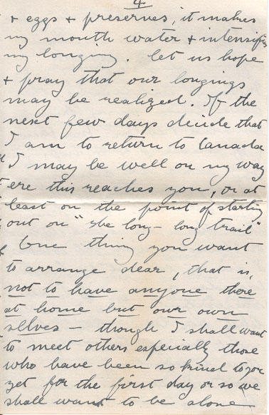 My its too good to think of & I cannot allow myself to count too much on such a prospect, just to fancy myself in the little kitchen sitting down to a tea with your dear self & Shirley & Billy - with real wheaten bread & farm butter to eat - with perhaps ham & eggs & preserves, it makes my mouth water & intensifies my longing, let us hope & pray that our longings may be realized. If the next few days decided that I am to return to Canada I may be well on my way eve this reaches you, or at least on the point of starting out on "the long -long trail" One thing you want to arrange dear, that is, not to have anyone there at home but our own selves - though I shall want to meet others especially those who have been so kind to you yet for the first day or so we shall want to be alone