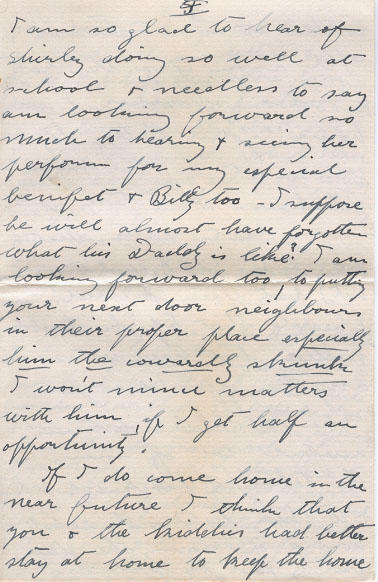 I am so glad to hear of Shirley doing so well at school & needless to say am looking forward so much to hearing & seeing her perform for my especial benefit & Billy too - I suppose he will almost have forgotten what his Daddy is like? I am looking forward too, to putting you next door neighbours in their proper place especially him the cowardly skunk I won't mince matters with him if I get half an opportunity.
