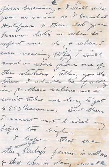 If I do come home in the near future I think that you & the kiddies had better stay at home to keep the home fires burning, & I will wire you as soon as I land at Halifax & then let you know later on when to expect me etc, & when I am nearing Wp'g I will send a wire from one of the stations, telling you the time I shall be pulling in, & then believe me it won't take me long to get to 853 Nassau. But there I must no build my hopes to high.
