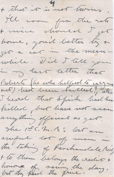 I hope that ere this reaches you Ruby's picnic is well over & that she is doing well& that it is not twins. I'll soon fix the rats & mice should I get home, you'd better try & get a cat in the meanwhile. Did I tell you in my last letter that Roberts (he who helped to carry me out) had been killed? also I heard that Spick had been killed, but have not seen anything official yet.