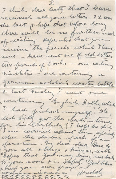 I think dear Betty that I have received all your letters 22 was the last, & hope that before long there will be no further need of writing. Hope also that you receive the parcels which I have send - have send one of old letters two parcels of books - one containing Mistletoe - one containing a German soldier's water bottle & last Friday I sent one containing English Holly which I had picked myself. Oh, did Billy get the cards in time for his birthday? I hope he did I am worried about him, especially when the doctors speak of an operation. My dear-dear love to you all & hugs & kisses, with hopes that God may bring me back to you soon & in safety. God bless & keep you, ever prays