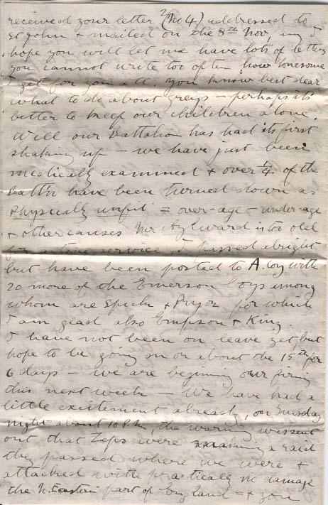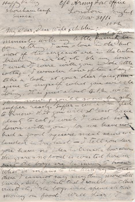 Just a few minutes with my little family before retiring, I am alone in the hut most of the sergeants are in the Canteen drinking beer etc, etc. Oh my how I wish that I were with you in the little cottage, I wonder how often a day I take a look at you dear faces, & imagine to myself what you will be doing. It is just about 4 P.M. with you now & you'll soon be getting supper ready. Supper - well I'm glad to know that you will at lest have plenty to eat, I wish that I could sit down with you, for we have not had a good square meal since we landed in England - I tell you dear you have no idea in Canada how serious things are = no food is wasted here in fact the boys are beginning to know what it means to be hungry - but there I cannot say anything more = tell Shirley & Billy I wish that I could eat the crusts etc, The boys will spend all their money on food. Well dear I received your letter (No 4) addressed to St John & mailed on the 8th Nov, my I hope you will let me have lots of letters you cannot write too often, how lonesome I get for you all. You know best dear what to do about Greys - perhaps it's better to keep our children alone. Well our battalion had had its first shaking up - we have just been medically examined & over ¼ of the Batt'n have been turned down as physically unfit = over-age - under-age & other causes Mr Aylward is too old for active service, I passed alright but have been posted to A. Coy with 20 more of the Emerson boys among whom are Spick & Pryor for which I am glad also [?] & King.