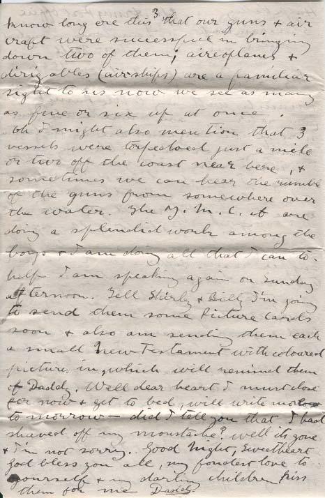 Oh I might also mention that 3 vessels were torpedoed just a mile or two off the coast near here, & sometimes we can hear the rumble of guns from somewhere over the water. The Y.M.C.A. are doing a splendid work among the boys & I am doing all that I can to help I am speaking again on Sunday afternoon. Tell Shirley & Billy I'm going to send them some picture cards soon & also am sending them each a small New Testament with colored pictures in, which will remind them of Daddy. Well dear heart I most close for now & get to bed, will write more tomorrow - did I tell you that I have shaved off my moustache? Well its gone & I'm not sorry. Good Night, Sweetheart God bless you all, my fondest love to yourself & my darling children kiss them for me Daddy