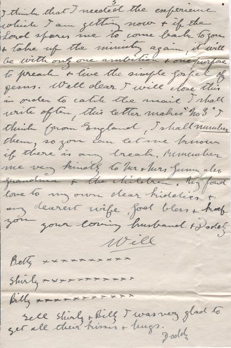 I am making some good friends here & shall get all the preaching etc I want to do - The Y.M.C.A. people are coming for me & passing over our chaplain, the boys also do not care for him he is never among them - I am certainly going to do all I can in the way of Christian Work, for this is the day of our opportunity - only last night 48 men too their stand for Christ after our service, & there are plenty of signs that many more will come I think that I needed the experience which I am getting now & if the Lord spares me to come back to you & take up the ministry again, it will be with only one ambition & one purpose to preach & live the simple gospel of Jesus. Well dear I will close this in order to catch the mail I shall write often, this letter makes "No 3" I think from England, I shall number them, so you can let me know if there is any break. Remember me kindly to Mr & Mrs Gunn also Grandma & the children. My fond love to my own dear kiddies & my dearest wife. God bless & keep you