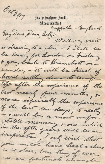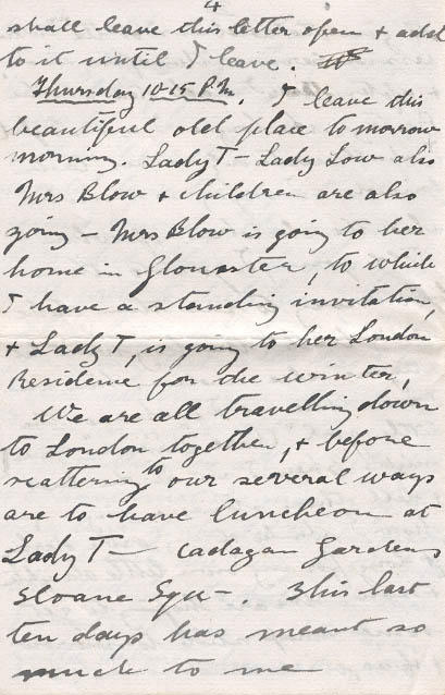 We are all traveling down to London together, & before scattering to our several ways are to have luncheon at Lady T- Cadagan Garden Sloane Squ-. This last ten days has meant so much to me it has been like living in a new world & will be a memory to which one will always look back to with pleasure.