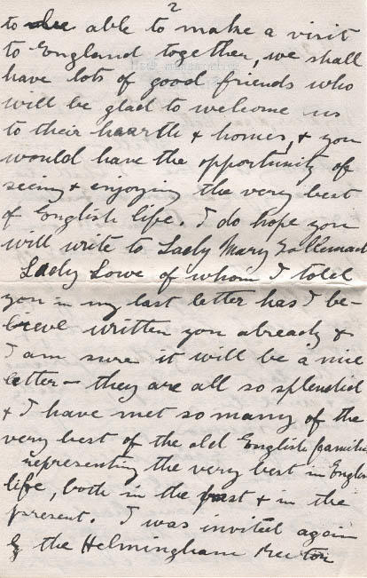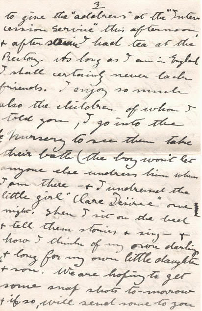 Well my visit is drawing to a close - I shall be leaving for London on Friday & going back to Bramshott on Sunday - it will be kind of hard settling down to camp life after the experience of the last nearly four months, & more especially the experience of the last ten days, it really is & will be a most unforgettable memory & one which in the after years will be an inspiration. I only wish that you could have had a share in it dear. One thing if ever we are fortunate enough to be able to make a visit to England together, we shall have lots of good friends who will be glad to welcome us to their hearth & homes & you would have the opportunity of seeing & enjoying the very best of English life. I do hope you will write to Lady Mary Tollemacke. Lady Lowe of whom I told you in my last letter has I believe written you already & I am sure it will be a nice letter - they are all so splendid & I have met so many of the & very best of the old English families representing the very best in English life, both in the past & in the present. I was invited again by the Helmingham Rector to give the "address" of the "Intercession service" this afternoon & after service. I had tea at the Rectory. As long as I am in England I shall certainly never lack friends. I enjoy so much also the children of whom I told you, I go into the Nursery to see them take their bath (the boy won't let anyone else undress him Then I am there -& I undressed the little girl "Clare Desiree" one night, when I sit on the bed & tell them stories & sing -& how I think of my own darlings & long for my own little daughter & son. We are hoping to get some snap shots to-morrow & if so, will send some to you shall leave this letter open & add to it until I leave.