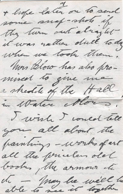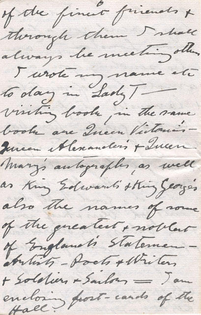 I wrote my name etc today in Lady T- visiting book, in the same book are Queen Victoria Queen Alexander's & Queen Mary's autographs, as well as King Edward's & King George's also the names of some of the greatest & noblest of England's statement Artist - Poets & Writers & Soldiers & Sailors = I am enclosing post-cards of the Hall. & hope later on to send some snap-shots if they turn out alright it was rather dull today when we took them.