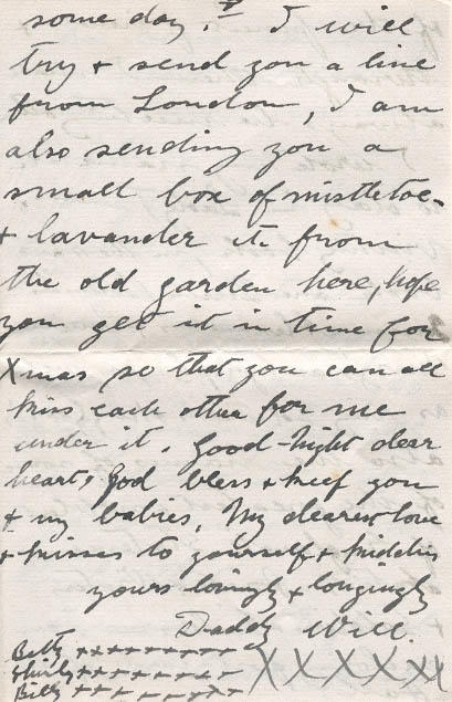 I wish I could tell you all about the paintings - works of art all the priceless old books, the armour etc etc - May be we'll be able to see it together some day, - I will try & send you a line from London, I am also sending you a small box of mistletoe & lavender etc from the old garden here, hope you get it in time for Xmas so that you can all kiss each other for me under it. Good-Night dear heart, God bless & keep you & my babies. My dearest love & kisses to yourself & kiddies.