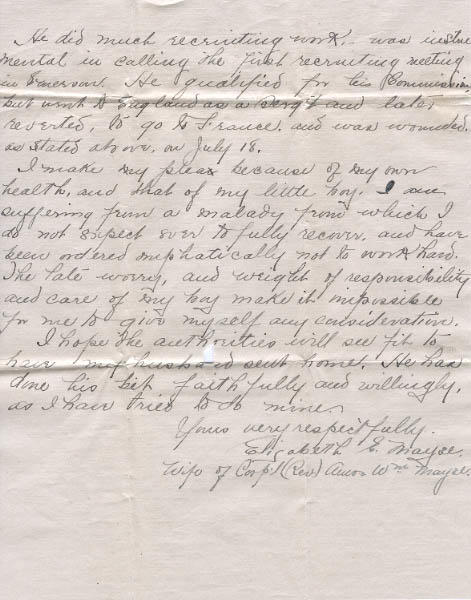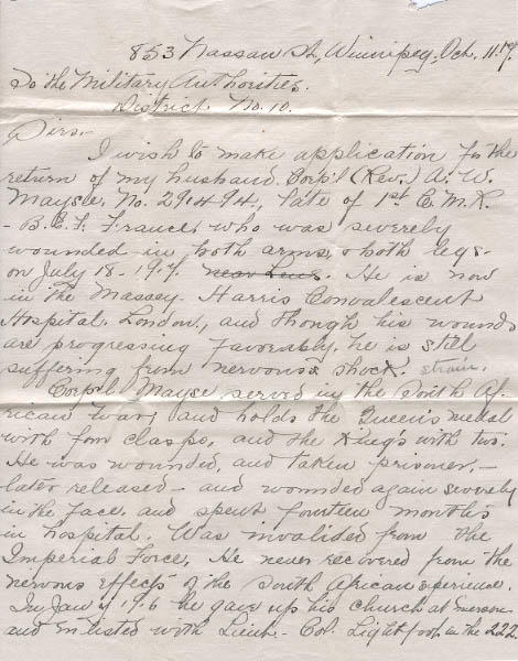 I wish to make application for the return of my husband Corp'l (Rev) A.W. Mayse, No. 291494. Late of 1st C.M.R. - B.E.F.: France, who was severely wounded in both arms & both legs - on July 18 - 1917. He is now in the Massey Harris Convalescent Hospital, London, and though his wounds are progressing favorably he is still suffering from nervous shock strain.