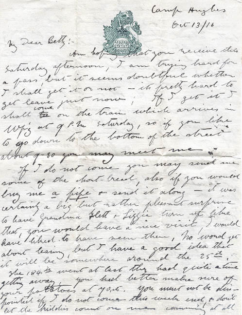 Am hoping that you receive this Saturday afternoon, I am trying hard for a pass, but it seems doubtful whether I shall get it or not - its pretty hard to get leave just now; If I get it I shall come on the train which arrives in Wp'g at 9 P.M Saturday, so if you like to go down to the bottom of the street about 9-30 you may meet me.