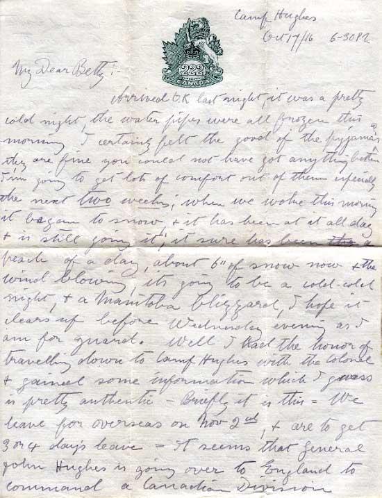 Arrived O.K. last night, it was a pretty cold night, the water pipes were all frozen this morning. I certainly felt the good of the pyjamas they are fine you could not have got anything better. I'm going to get lots of comfort out of them especially the next two weeks; when we woke this morning it began to snow, & it has been at it all day & is still going it; it sure had been a peach of a day, about 6" of snow now & the wind blowing, its going to be a cold - cold night, & a Manitoba blizzard, I hope it clears up before Wednesday evening as I am for guard. Well, I had the honor of traveling down to Camp Hughes with the Colonel & gained some information which I guess is pretty authentic - Briefly it is this = We leave for overseas on Nov 2nd, & are to get 3 or 4 days leave = It seems that General John Hughes is going over to England to command a Canadian Division & as our Battalion is the best all round Battn in Camp Hughes, he is keeping us to go with him - We are the best shooting battalion in camp & our machine gun section have come out 1st of all the Battn's in Canada & generally we hold 1st place for all round efficiency, of course this means that we shall not be broken up like the others when we get across, but shall cross over to France at an early date as a battalion.