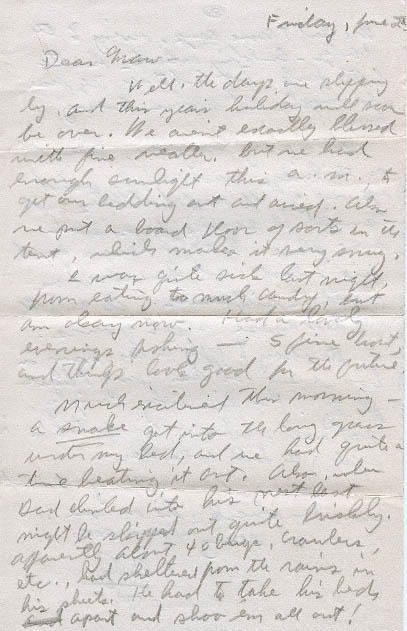 Much excitement this morning - a snake got into the long grass under my bed, and we had quite a time beating it out. Also, when Dad climbed into his nest last night he slipped out quite briskly. Apparently about 40 large, crawlers, etc., had sheltered from the rains in his sheets. He had to take his bed apart and shoo em all out! We had to move camp owing to the bridge-building [?] in the little park. Too bad to see the fine old maples and alders coming down.