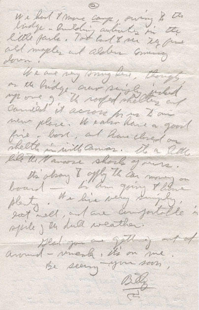 We are very snug here, though, as the bridge crew [?] picked up one of the roofed shelters and carried it across for us to our new place. We have a good fire-box, and have closed our shelter in with canvas. It's a little like the [?] shack of ours.