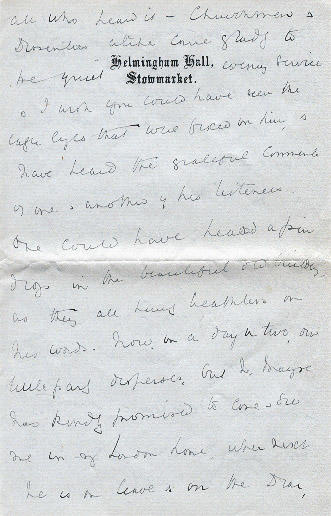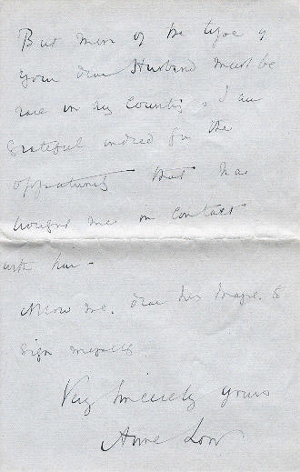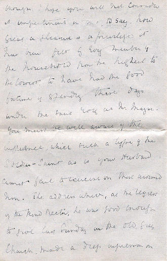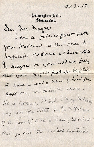 Your dear husband declares himself to be feeling really much [?] stronger for this green Rest. It is superfluous though I hope you will not consider it impertinent of me to say how great a pleasure & a privilege it has been felt by every member of the household from the highest to the lowest to have had the good fortune of spending these days under the same roof as Mr. Mayse. You must be well aware of the influence which such a type & the Soldier-Saint as is your husband.[?] fail to increase on those around him. The address which [?] he was good enough to give even fondly in the Old Grey Church made a deep impression on all who heard it - Churchman & listeners alike came gladly to the quiet evening service & I wish you could have seen the eager eyes that were fixed on him & have heard the grateful comments of one or another of his listeners. One could have heard a pin drop in the beautiful old building as they all hung breathless on his words. Now in a day or two, our little party disperses. Our Mr. Mayse has kindly promised to come see me in my London home when next he is on leave & on the [?] Mother-City. And I am hoping also that he will allow me to introduce him to other friends who will feel it indeed a pleasure to welcome him. I wish I could pass on to you the [?] & of the passionate gratitude, the passionate admiration that is felt for you & our Noble Canadian Soldier by our Common - Mother - Country How [?] should it not be so But men of the type of your own husband must be rare in any country & I am grateful indeed for the opportunity that had brought me in contact with him.