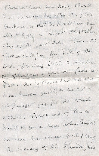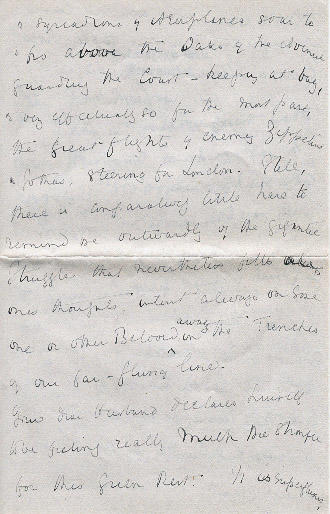 He is looking, I think I may truthfully say, all the better for the restfulness of the Countryside & I am glad [?] that you once the English autumn should have been kind, should have given us day after day of calm sunshine, so that he should have been able to enjoy in comfort the Golden glory of the great oaks = Elms - the ; "best we can do", on this side of the wide dividing Water to emulate the splendours of you own Canadian Fall - that he should have been able to sun himself quietly on the Old red parapet far from the sound and strife. Though indeed this is hardly so, for in these Garden countries again the quiet plants [?] of the Flanders Guns & squadron of aeroplanes soar to & from above the Oaks by the Avenue guarding the Court - keeping at bay & very effectively so for the most part, the great flights of enemy Zeppelin & [?] steering for London. All the while there is comparatively little here to remind me outwardly of the [?] struggle that nevertheless fills ones thoughts intent always on some one or other Below away in the Trenches of out far-flung line.