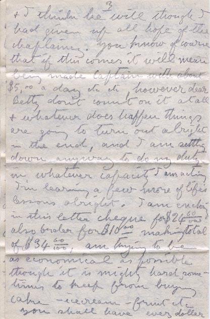 Was hoping to get a letter from you this morning but it may be along with the evenings mail. We are getting settled down by degrees - but oh my it has been rough especially on some the weather has been so hot too - five men were taken off parade yesterday ‘sunstroke' one of them died in the evening. I am still corporal but I have reason to think that my promotion will come if I possess myself with patience & show my efficiency its = It has also been intimated to me that I am to get the chaplaincy of the Battalion when time comes for the appointment to be made I was told this in confidency by a person who heard the officers discussing the matter & my name was the only name mentioned, then this morning the colonel? (Lightfoot) was speaking to me, & told me that he was giving me 1,100 hymn books & a piano to use for services among the men, so this looks very much as though I was in line for the chaplains appointment. Of course I was not going to build my hopes etc upon getting this post - I have already learned not to expect too much but I have always had confidence in Lightfoot that he would do the right thing & I think he will though I had given up all hope of the chaplaincy. You know of course if this comes it will mean being made Captain with about $5,00 a day etc etc, however dear Betty don't count on it at all & whatever does happen things are going to turn out alright in the end, and I am settling down anyway to do my duty in whatever capacity I am acting I'm learning a few more of life's lessons alright. I am enclosing in this letter cheque for $ 24.60 also order for $ 10.00 making total of $ 34.60, am trying to be as economical as possible though it is mighty hard sometimes to keep from buying cake - ice cream - fruit etc you shall have every dollar that I can possibly spare, I guess that I'll be able to let you have $ 10 certain & maybe $ 15 per month - Be sure to let me know if you are getting your different allowances alright & how much.