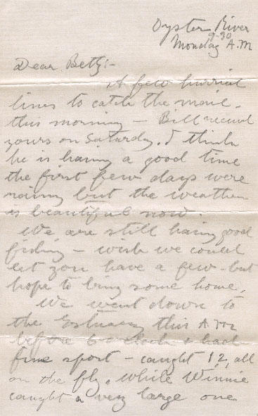 We went down to the Estuary this a.m. before 6 o' clock & had fine sport - caught 12 all on the fly, while Winnie caught a very large one right at the camp pool.
