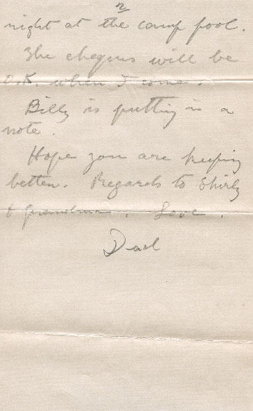 A few hurried lines to catch the mail this morning - Bill received yours on Saturday. I think he is having a good time the first few days were rainy but the weather is beautiful now.