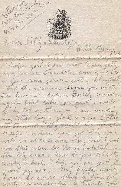 Hello there! & how's my little son & daughter I hope you have not been getting any more tumbles Sonny - & how is your rose garden getting along Shirley Did the woman chase you with the broom? When Daddy comes home again he'll take you over & we'll pick lots of them - I am sending my little boy & girl a nice little testament - they will be nice to keep & when you get big, you will be able to say - My Daddy sent me this when he was soldier in the big war. How do you like the Sunday School I hope you are good, I guess you are, My, Pappa comes home he will have a fine big curly moustache to tickle your faces with when he kisses you won't that be fun, it will be something like this