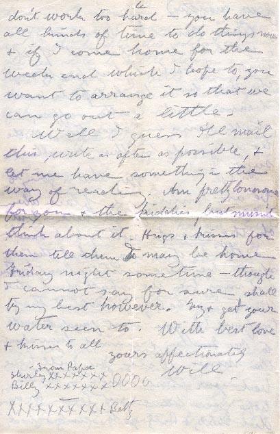 Well I guess I'll mail this, write as often as possible, & let me have something in the way of reading. Am pretty lonesome for you & the kiddies, but mustn't think about it. Hugs & kisses for them tell them I may be home Friday night sometime - though I cannot say for sure shall try my best however. [?] & get your water seen to. With best love & kisses to all