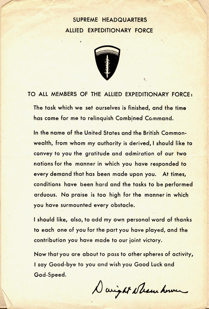 In the name of the United States and the British Commonwealth, from whom my authority is derived, I should like to convey to you the gratitude and admiration of our two nations for the manner in which you have responded to every demand that has been made of you. At times, conditions have been hard and the tasks to be performed arduous. No praise is too high for the manner in which you have surmounted every obstacle.