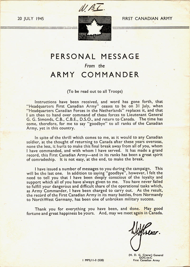 I have issued a number of messages to you during the campaign. This will be the last one. In addition to saying "goodbye", however, I felt the need to tell you that I have been deeply conscious of the loyalty and support which all of you have always given to me. You have never failed to fulfill your dangerous and difficult share of the operational tasks which, as Army Commander, I have been charged to carry out. As the result, the record of the First Canadian Army in its many battles, from Normandy to NorthWest Germany, has been one of unbroken military success.