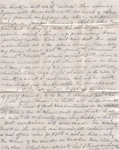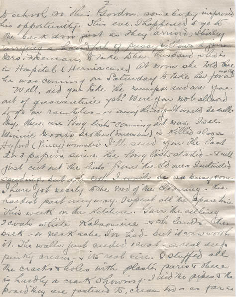 Well, did you take the mumps and are you out of quarantine yet? Were you not allowed to go on rambles or anything it would be dull. My, there are long lists coming out now. I see Winnie Norris brother (Emerson) is killed also a Hyford (Percey) wounded. I'll send you the last 2 or 3 papers since the long lists started - I will just cut out the lists from the old ones I intended to send but did not. I will be so busy soon. I have got nearly to the end of cleaning - the hardest part anyway. I spent all the spare time this week in the kitchen. Gave the ceiling 2 coats of white Kalsomine - & oh laud - the back and neck ache I've had - but it was worth it. The walls just needed a coat - real deep pinky cream - & its real nice. I stuffed all the cracks and holes with plaster paris & there is hardly a crack showing. I did the pipes & the board they are painted to cream too as far as the tank is will do it "silver". This evening I gave all the woodwork one coat of silver grey paint, and gave the stoves & pipes range a proper cleaning. That is where I am now, but today I gave the whole place a sweep - scrub and clean up for Sunday. I am feeling rather tired, but now that the dirt is cleaned out, & the place clean, I can take my time. It cost Kal .40, paint .45, Aluminum .55, [?] .25, oilcloth .80, plaster paris $2.80. I have two cans varnish we got when we came in line and I may do some of the furniture - the 3 kitchen chairs & table legs. I got oilcloth for the table & I think I want to put some behind the sink - could not get the [?] same so will paint the sink white. I got up the big can of grey paint - to do the 2 doorsteps - the little green chairs - & later will do the [?] floor. I have to put new curtains on the shelves. So there's the kitchen; don't you think it will be nice? It certainly was very shabby and dirty.
