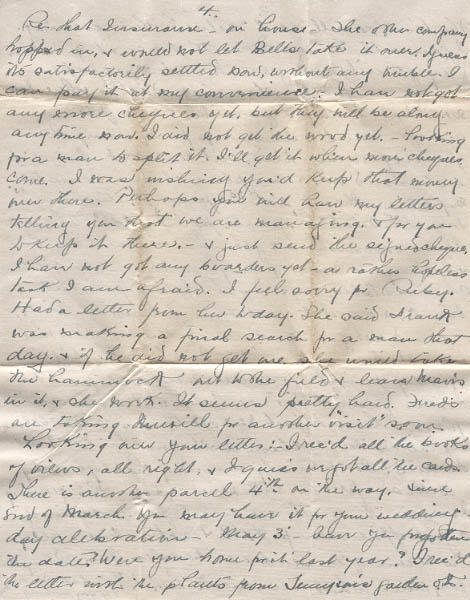 Re: that insurance - on house - the other company popped in and would not let Bell's take it over. Guess its satisfactorily settled now, without any trouble. I can pay it at my convenience. I have not got any more cheques yet, but they will be along anytime now. I did not get the wood yet - looking for a man to split it. I'll get it when more cheques come. I was wishing you'd keep that money over there. Perhaps you will have my letters telling you that we are managing. For you to keep it there - & just send the signed cheques. I have not got any boarders yet - another hopeless task I am afraid. I feel sorry for Ruby. Had a letter from her today. She said Frank was making a final search for a man that day & if he did not get one she would take the hammock out to the field & leave Mavis in it & she would work. It seems pretty hard. Fred's are taking [?] for another visit soon.