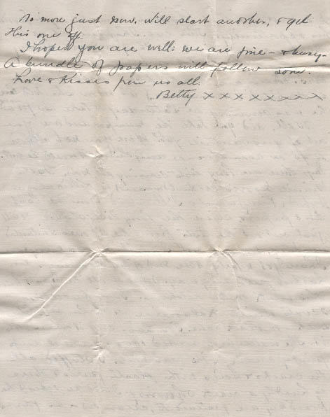 Imagine my surprise to find you are still in England. I don't think I knew how much I had been pushing it, till your letter came. I nearly had a fit between the letter and the kids. I was crying & Shirley ran to get a big handkerchief & got one arm around my neck & started mopping it off. She says, "Billy, run & get a dish to catch them," & Billy hiked to the pantry and got a bread pan. By this time, I was able to tell him I'd manage now & after a while I heard him muttering away, over by himself "Shame" - "Shirley, I'd just go and leave her there." It was funny. Billy tries to be like you now. When I am washing, he comes in once in a while & says, "Well, Mother, how are you getting on at the washing?" So Shirley is pretty taken up with school and she has a lover - she announced the other day - after I asked her who it was walked home from school with her. I saw the two standing & a man passing them, turning to look back at them. You see, Herbie Gunn got German measles so Willie could not go to school, so this Gordon somebody improved his opportunity. This eve I happened to go to the back door just as they arrived, Shirley carrying a handful of pussy willows to give Mrs. Foreman to take to her husband who is in hospital (Hernia case). At sum she told me he was coming on Saturday to take her for a walk.