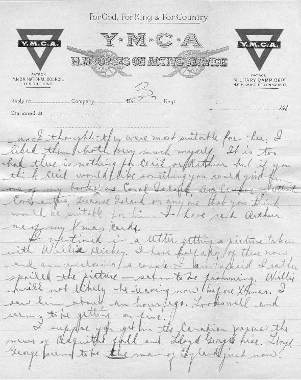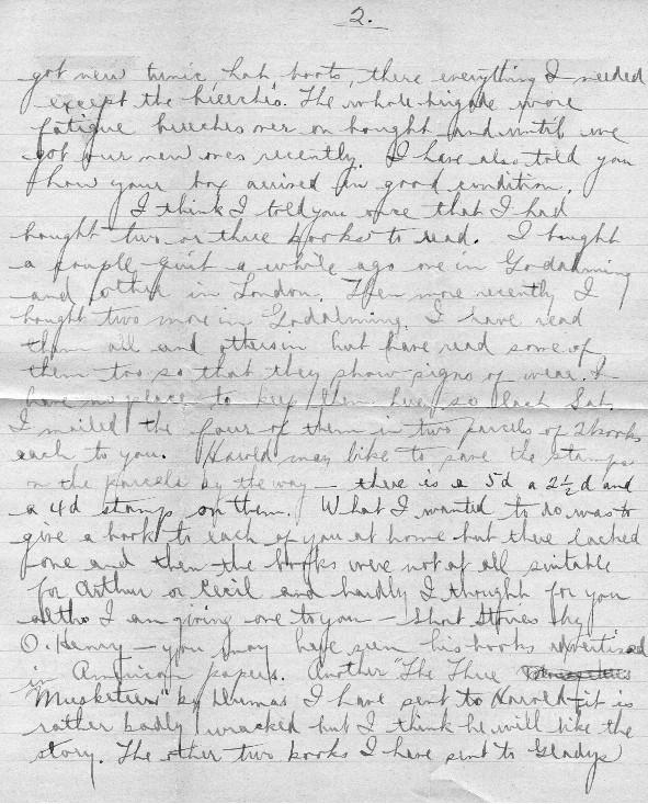 I think I told you once that I had bought two or three books to read. I bought a couple, quite a while ago one in Godalming and other in London. Then more recently, I bought two more in Godalming. I have read them all and others in hut have read some of them too, so that they show signs of wear. I mailed the four of them in two parcels of 2 books each to you. Harold may like to save the stamps on the parcels, by the way - there is a 5d, a 2½d and a 4d stamp on them. What I wanted to do was to give a book to each of you at home but there lacked one and then the books were not at all suitable for Arthur or Cecil and hardly I thought, for you, altho, I am giving one to you - Short Stories by O. Henry - you may have seen his books advertised in American papers. Another "The Three Musketeers" by Dumas, I have sent to Harold - it is rather badly wrecked, but I think he will like the story. The other two books I have sent to Gladys as I thought they were most suitable for her. I liked them both very much myself. It is too bad there is nothing for Cecil or Arthur but, if you think Cecil would like something, you could give him one of my books as Coral Island, Dvg(?) Crusoe, Scottish Covenanters, Treasure Island or any one that you think would be suitable for him. I have sent Arthur one of my Xmas cards.