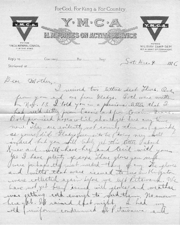 I received two letters last Thurs., one from you and one from Gladys. Both were written on Nov. 19. I told you in previous letter that I had rec'd letter from Cassie and from cousin Grace. Both promised boxes which should get here anytime now. They are evidently not coming thru as quickly as yours did. Gladys seems to be doing very well indeed but you will likely get this letter about Xmas and will have her and Cecil with you. Yes, I have plenty of sox. Those gloves you sent were perhaps the most needed thing of any. The gloves and mitts that were issued to me in Kingston were collected again before we left Petawawa. We have not yet been issued with gloves and weather was getting cold enough to need them. No snow here yet. It rained last night. I had my old uniform condemned at Petawawa and got new tunic, hat, boots, there - everything I needed except the breeches. The whole brigade wore fatigue breeches over on boat and until we got our new ones recently. I have also told you how your box arrived in good condition.
