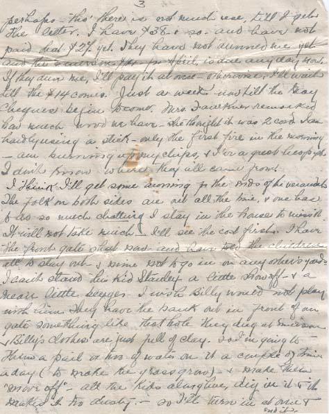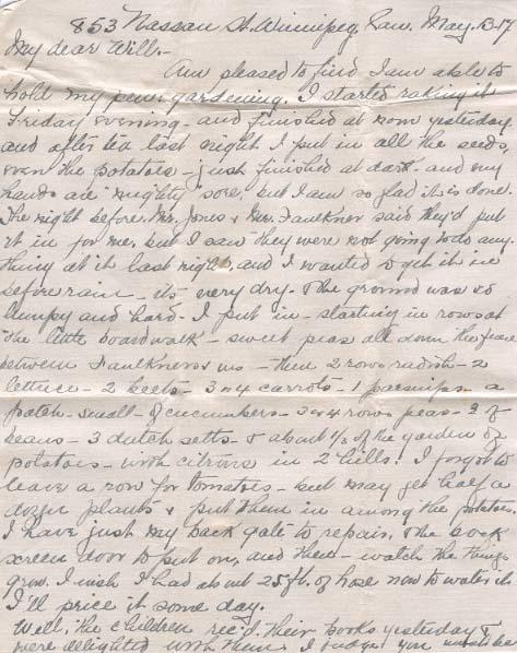 Billy & I went down to Steele Briggs for our seeds on Fri. p.m. Mrs. Faulkner & Stanley were just on their way too, & we caught up to them so went together. She is very friendly this summer. I spoke of making Shirley a hat & she said she was a milliner, & would make it if I got the shape so that will be a cut in expenses. The very plainest white straw with black band is $1.00 but I expect we can fix one up - a real fancy one for 25 or 40¢ or maybe less. We are not spending much now, only just for food. The draft has not yet come; I'll wait a day or two or perhaps till your letters - or no - I'll please to see perhaps [?] there is not much use, till I get the letter. I have $38 or so and have not paid that $27 yet. They have not dunned me yet and the Emerson $100 - for April, is due any day now. If they dun, I'll pay it at once - otherwise, I'll wait till the $14 comes. Just a week until the May cheques begin to come. Mrs. Faulkner remarked how much wood we have - she thought it was 2 cord. I am hardly using a stick - only the first fire in the morning - am burning up my chips, & I'er a great heap yet. I don't know where they all come from. I think I'll get some awnings for the ends of the verandah. The Folk on both sides are out all the time, & one has so much chatting I stay in the house to miss it. It will not take much - I'll see the cost first. I have the front gate shut now and told the children all to stay out - & some not to go in on any others yards. I can't stand the kid Stanley a little showoff - & a near little begger. I wish Billy would not play with him. They have the bank out in front of our gate something like that hole they dug at Emerson & Billy's clothes are just full of clay. So I'm going to throw a pail or two of water on it a couple of times a day (to make the grass grow) & make them move off - all the kids along here, dig in it & make it too dusty - so I'll turn in at once & end it. I have been on the verandah for half an hour - and the two fire brigades went past again. That is 3 times since Wednesday. I think it was gran's pies before, but I don't know what it was this time. Being Sunday, it brought the crowd out.