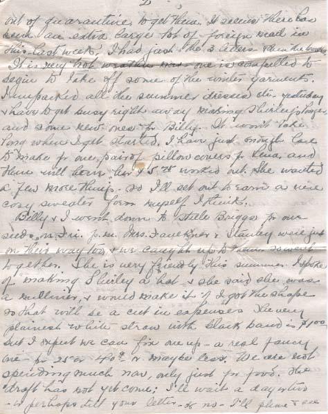 Well, the children rec'd their books yesterday & were delighted with them. I judge you would be out of quarantine to get them. It seems there has been an extra large lot of foreign mail in this last week. I had just the 3 letters - then the books. It is very hot weather now, one is compelled to begin to take off some of the winter garments. I unpacked all the summer dresses etc. yesterday & have to get busy right away making Shirley's longer and some new ones for Billy. It won't take long when I get started. I have just enough lace to make for one pair of pillow covers for Lena, and then will [?] her $5.75 worked out. She wanted a few more things. So I'll set out to earn a nice cosy sweater for myself I think.