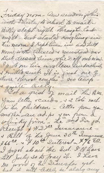 Got a gust of mail this A.M. Your letter & cards - & 2 lots salt for the children - letters from your mother - an ad for you from a whiskey firm. The [?] I've got. Receipt for $27.00 Insurance - & Bill of the June 30th Insurance $66.20 & $10.60 Interest = $76.80. I forgot about the Int. I'll have till July 30 to pay it. I have no word of the transfer yet but it will likely be along any day now.