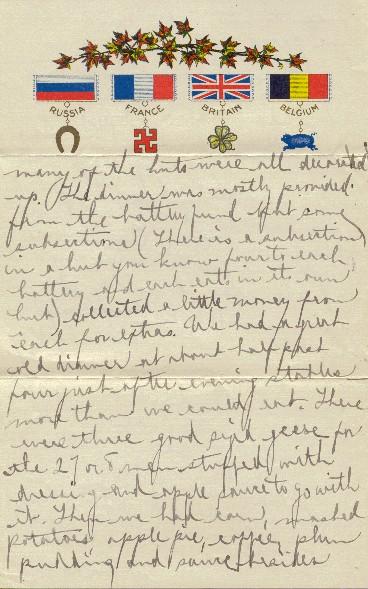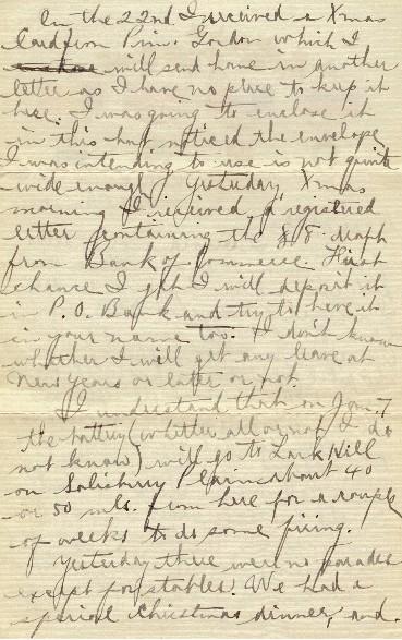 Yesterday, there were no parades except for stables. We had a special Christmas dinner and many of the huts were all decorated up. The dinner was mostly provided from the battery fund but some subsections (There is a subsection in a hut you know, four to each battery and each eats in its own hut.) collected a little money from each for extras. We had a great dinner at about half past four, just after evening stables - more than we could eat. There were three good sized geese for the 27 or 28 men - stuffed with dressing and apple sauce to go with it. Then we had corn, mashed potatoes, apple pie, coffee, plum pudding and sauce besides biscuits, nuts etc. so you see we fared pretty well.
