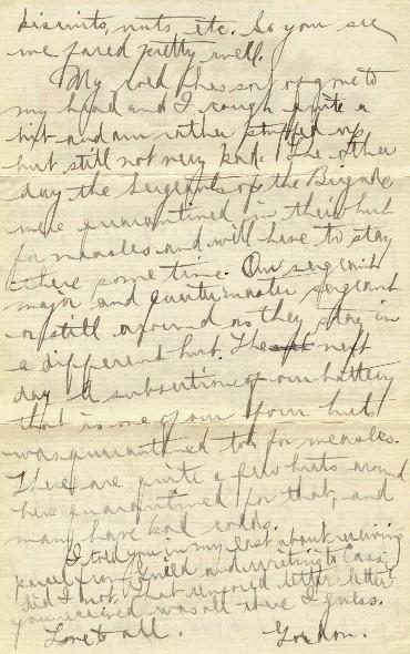 My cold has sort of gone to my head and I cough quite a bit and am rather stuffed up, but still not very bad. The other day, the sergeants of the Brigade were quarantined in their hut for measles and will have to stay there some time. Our sergeant major and quartermaster sergeant are still around as they stay in a different hut. The next day, a subsection of our battery, that is one of our four huts, was quarantined too for measles. There are quite a few huts around here quarantined for that, any many have bad colds.