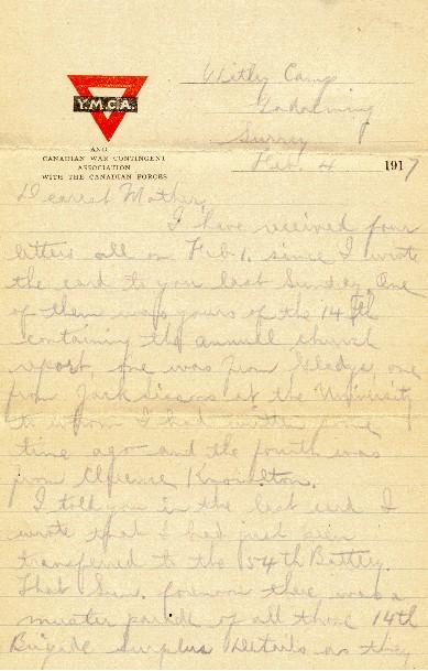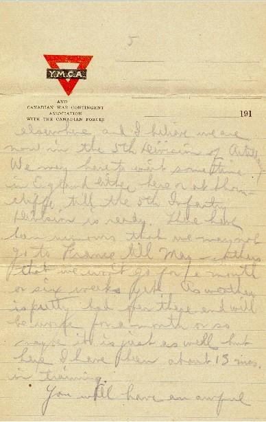 The Brigades here have been in 4th Artillery Division, but that Division may now be made up of drafts at Shorncliffe & elsewhere and I believe we are now in the 5th Division of Artillery. We may have to wait sometime in England, either here or at Shorncliffe till the 5th Infantry Division is ready. There have been rumours that we may not go to France till May - others, that we won't go for a month or six weeks yet. As weather is pretty bad over there and will be worse for a month or so, maybe it is just as well, but here I have been about 13 mos. in training.
