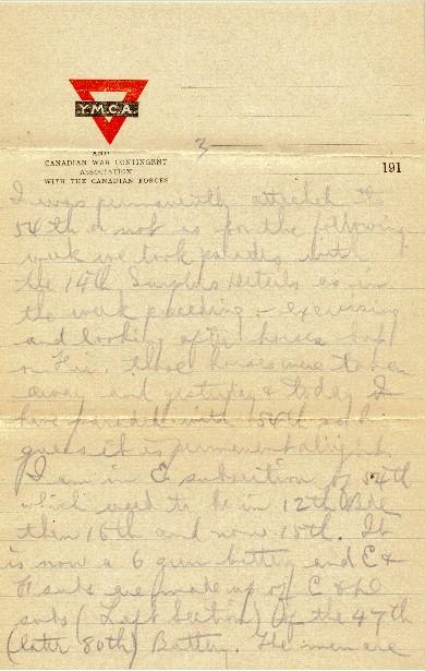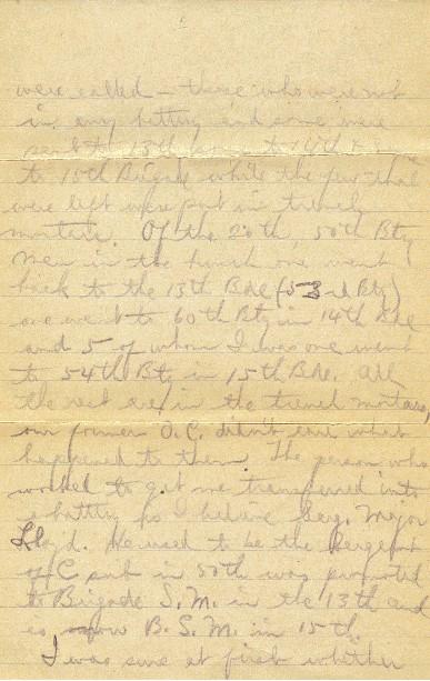 I told you in the last card I wrote that I had just been transferred to the 54th Battery. That Sun. forenoon, there was a muster parade of all those 14th Brigade Surplus Details, as they were called - those who were not in any battery and some were sent to 13th, some to 14th & some to 15th Brigade, while the few that were left were put in trench mortars. Of the 20th, 50th Bty men in the bunch, one went back to the 13th Bde (53rd Bty), one went to 60th Bty in 14th Bde and 5 of whom I was one, went to 54th Bty in 15th Bde. All the rest are in the trench mortars, our former O.C. didn't care what happened to them. The person who worked to get me transferred into a battery is, I believe, Serg. Major Lloyd. He used to be Sergeant of C sub in 50th, was promoted to Brigade S.M. in the 13th and is now B.S.M. in 15th.