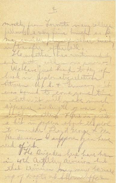 The weather has continued dry and pretty cold - no snow. We have just heard today of break in diplomatic relations between U.S. & Germany - it was to come sometime - whether it will make much difference in length of war, is another matter. There is quite a bit in papers about the plot to murder Lloyd George & Mr. Henderson - I suppose you have read of it.