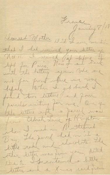 Did I ever mention that I had received your letter of Nov. 11. I received it before I left for Paris. Now I am back with the battery again. We are not far from where we were before. When I got back I found two letters and four parcels waiting for me. One of the letters and a parcel was from Eldred Lane of Kingston whom I met in Butternut Bay. The parcel had in it a little cake and chocolate. The other letter was from you, dated Dec. 1. It contained a little letter and an Xmas card from Arthur.