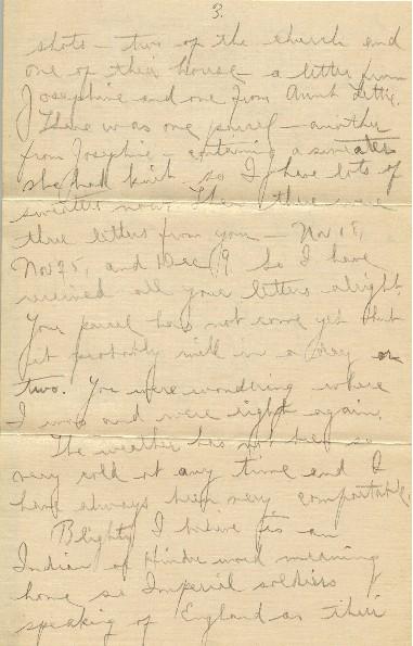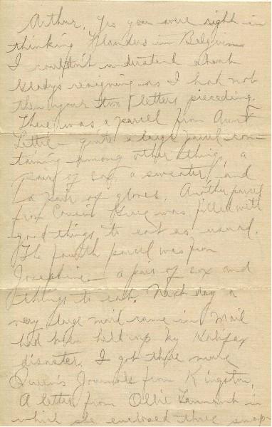 Yes, you were right in thinking Flanders in Belgium. I couldn't understand about Gladys resigning as I had not then your two letters preceding. There was a parcel from Aunt Lettie - quite a large parcel containing, among other things, a pair of sox, a sweater, and a pair of gloves. Another parcel from cousin Grace was filled with good things to eat as usual. The fourth parcel was from Josephine - a pair of sox and things to eat.