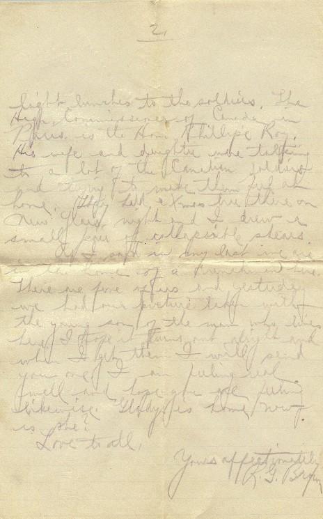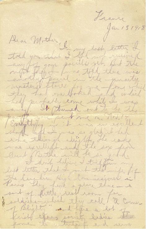 I don't believe I told you in my last letter that I met the wife of the Canadian High Commissioner in Paris. They have a place there - a sort of little rest room for soldiers which they call "a Corner of Blighty" and here a lot of first class society ladies come to entertain and serve light lunches to the soldiers. The High commissioner of Canada in Paris is the Hon. Phillipe Roy. His wife and daughter were talking to a lot of the Canadian soldiers and trying to make them feel at home. They had an Xmas tree there on New Year's night and I drew a small pair of collapsible shears. As I said in my last letter, we are in the home of a Frenchman here. There are five of us and yesterday we had our picture taken with the young son of the man who lives here. I hope it turns out alright and when I get them, I will send you one. I am feeling real well and hope you are feeling likewise. Gladys is home now, is she? Love to all,