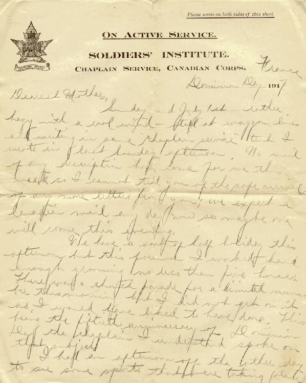 Sunday and July 1st rather hazy and a cool wind - still at waggon lines and writing in same "Chaplain service" tent I wrote in last Sunday afternoon. No mail of any description has come for me this week so I cannot tell you of the safe arrival of any more letters from you. We expect a Canadian mail any day now so maybe one will come this evening.