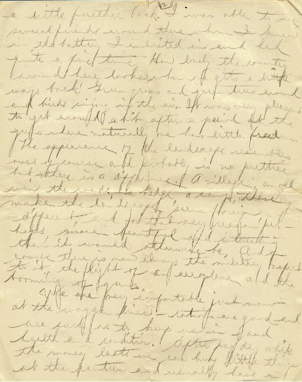 I had an afternoon off the other day to see some sports that were taking place a little further back. I was able to see several friends around there whom I knew in the battery I enlisted in and had quite a fine time. How lovely the country around here looks when one gets a little ways back! Green grass and green trees around and birds singing in the air. It was very pleasant to get around a bit after a period at the guns where naturally one has little freedom. The appearance of the landscape resembles ours, of course, and probably is no prettier but, there is a difference. A village, an old ruin, the roads, a hedge, a camp, these make the landscape seem foreign, different and for that very reason perhaps, more beautiful and interesting that it would otherwise be. And, of course, there is now always the military aspect to it, the flight of an aeroplane and the booming of guns.