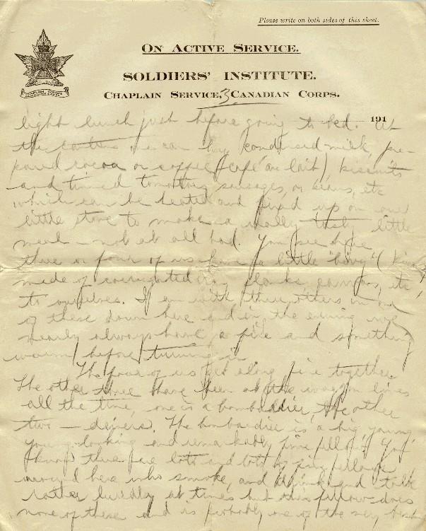 The four of us get along fine together. The other three have been at the waggon lines all the time, one is a bombardier, the other two - drivers. The bombardier is a big, young-looking and remarkably fine fellow. You know there are lots and lots of the fellows around here who smoke and drink and talk rather luridly at times but this fellow does none of these and is probably one of the very best in a strict, moral sense that I have come across. The other two - smoke a great deal as does nearly everyone - one is about twenty-six, has knocked about Canada quite a bit, is rather crusty and sarcastic, even ill tempered at times - one who some people would find it hard to get along with - the other - about twenty-four - probably the laziest and most good natured fellow I ever met. Oh, we have a pretty good time. They made room for me in their bivy when I came down from the guns and we get along now so nicely. Of course, these are all fellows of the last subsection I was in, in the battery in England whom I have known now for some time.