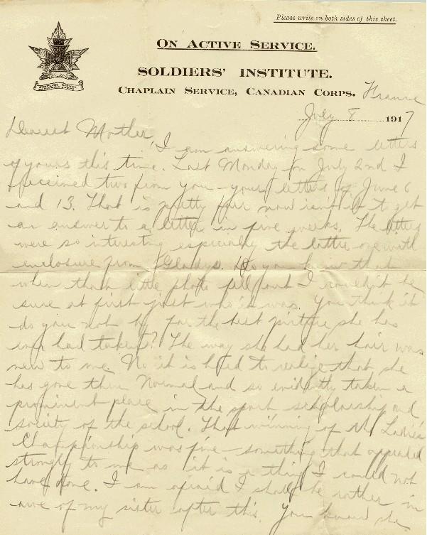 I am answering some letters of yours this time. Last Monday on July 2nd, I received two from you - your letters of June 6 and 13. That is pretty fair now isn't it to get an answer to a letter in five weeks? The letters were so interesting especially the latter one with enclosure from Gladys. Do you know that when that little photo fell out, I couldn't be sure at first just who it was. You think it, do you now, by far the best picture she has ever had taken? The way she had her hair was new to me. No, it is hard to realize that she has gone there to Normal and so evidently taken a prominent place in the sport scholarship and society of the school. That winning of the Ladies' Championship was fine - something that appealed strongly to me as it is a thing I could not have done. I am afraid I shall be rather in awe of my sister after this. You know she said she had had a larger snap but a Normalite had taken it. Yes, I am sure he would like to have it. I showed the picture to the other fellows in our "bivy". They thought it fine and said there was a great likeness to me. We like to get pictures very much. I have seen pictures of the other fellows' sisters and sweethearts.