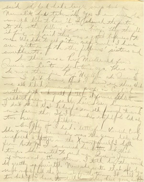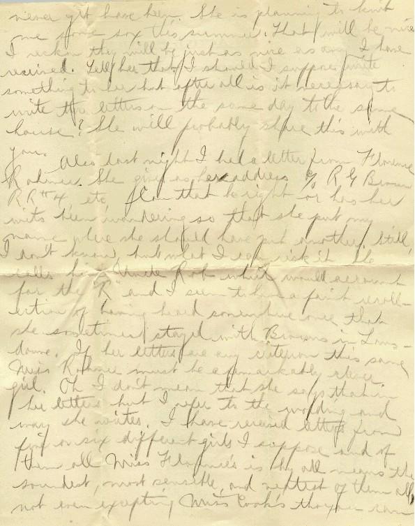 Also, last night, I had a letter from Florence Rahmer. She gives as her address - c/o R.G. Brown, R.R. #4, etc. Can that be right or has her wits been wandering so that she put my name where she should have put another? Still, I don't know but what I can risk it. She calls him Uncle Rob which would account for the "R" and I seem to have a faint recollection of having heard somewhere once that she sometimes stayed with Browns in Lansdowne. If her letters are any criterion, this same Miss Rahmer must be a remarkably clever girl. Oh, I don't mean that she says that in her letters but I refer to the wording and way she writes. I have received letters from five or six different girls, I suppose, and of them all, Miss Florence's is by all means the soundest, most sensible, and neatest of them all, not even excepting Miss Cook's, tho you can tell from the manner of her letter that she has been thru college. For instance Miss Florence begins "I do not know how far excuses go with you and so had better not make any, but I have intended to answer ..." and ends, "I received a card from a friend who is a prisoner in Germany and since I must write to him, I shall close, hoping to hear ...." - a rather neat start and finish I thought.