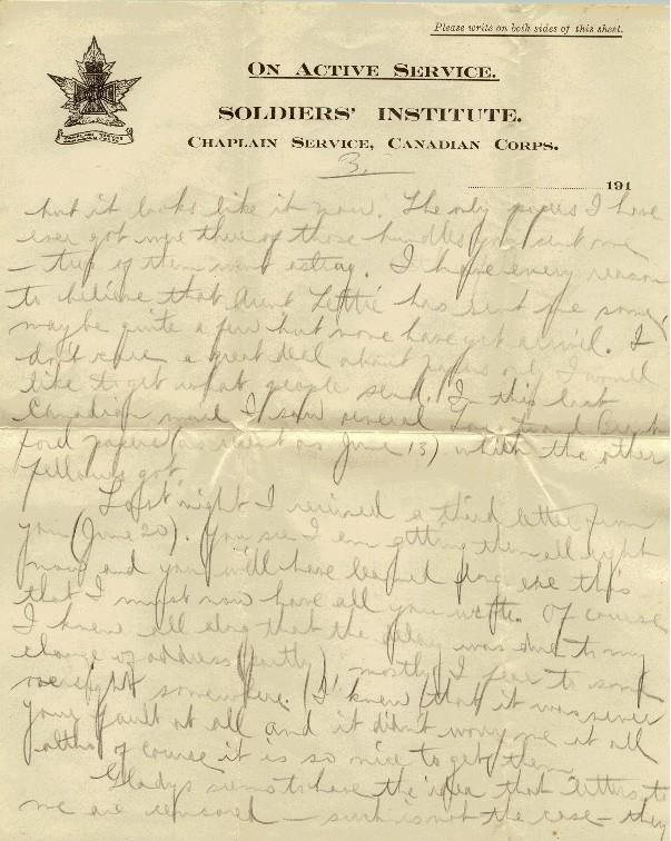 On July 5, I had a letter from Violet Cook. She, you may remember, was the young lady who enclosed a letter in the Xmas parcel I had from Arts'17. I answered her letter at that time. She wanted to send me Queen's Journals if I was not getting them. I told her they would be greatly appreciated. Now, she writes that she has sent nearly all the Journals for the term. It will be too bad if I have to tell her they have gone astray, but it looks like it now. The only papers I have ever got were three of those bundles you sent me - two of them went astray. I have every reason to believe that Aunt Lettie has sent me some, maybe quite a few, but none have yet arrived. I don't care a great deal about papers, only I would like to get what people send. In this last Canadian mail, I saw several Toronto and Brantford papers (as recent as June 13) which the other fellows got.