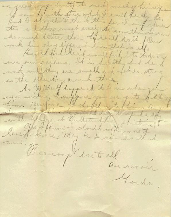 Gladys seems to have the idea that letters to me are censored - such is not the case - they never yet have been. She is planning to knit me some sox this summer. That will be nice. I reckon they will be just as nice as any I have received. Tell her that I should, I suppose, write something to her but after all is it necessary to write two letters on the same day to the same house? She will probably share this with you.